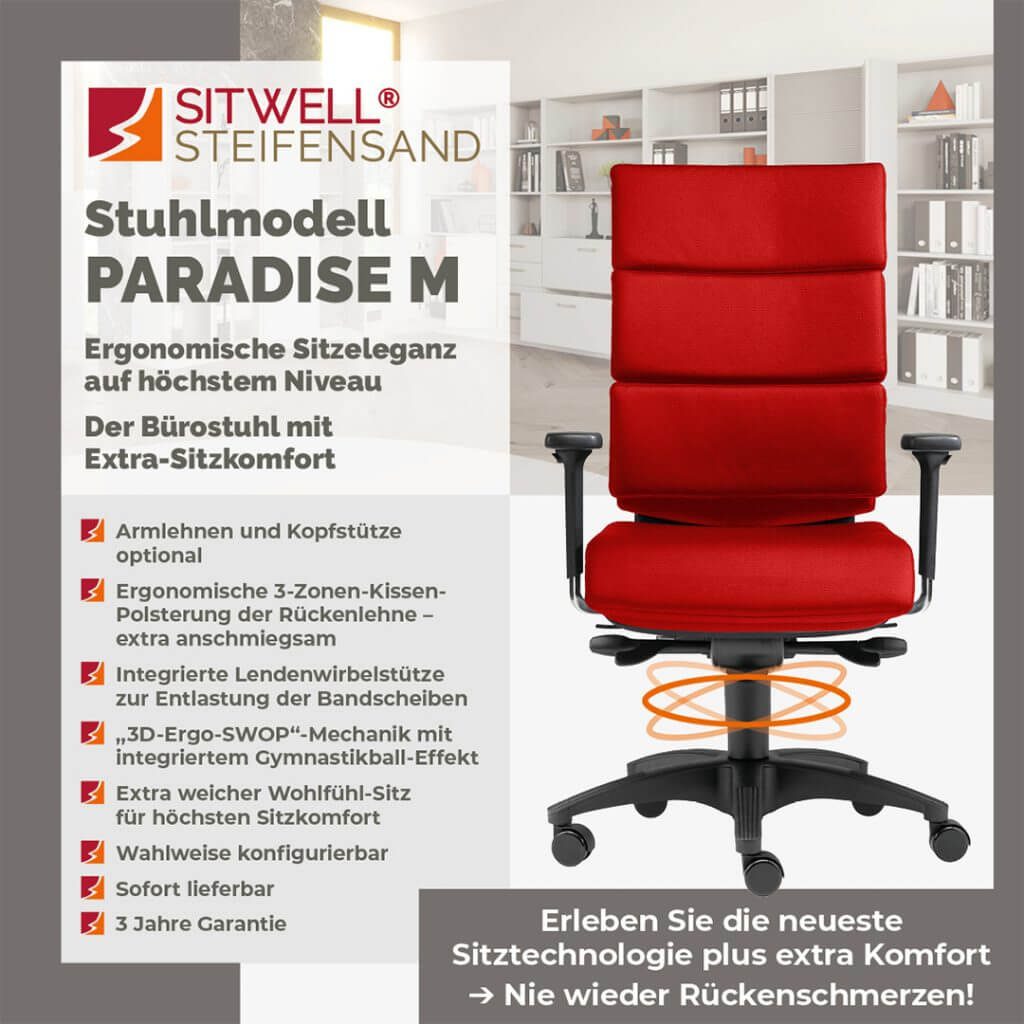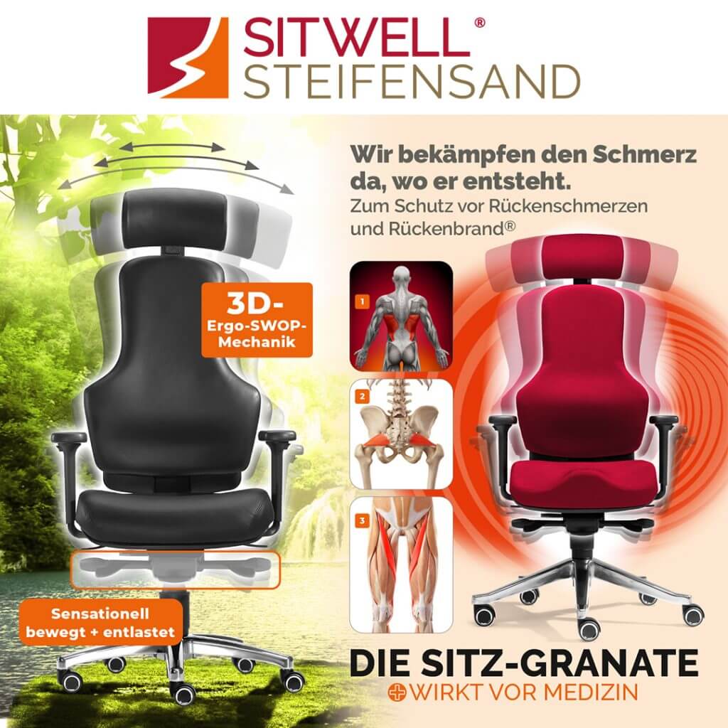 Seit mehr als drei Jahrzehnten widmet sich die SITWELL® STEIFENSAND AG der Konzeption erstklassiger ergonomischer Sitzlösungen, die Funktionalität mit ansprechendem Design und Langlebigkeit verbinden. Ein herausragendes Merkmal unserer Premium-Modelle ist der Einsatz exzellenter Materialien – von edlem Echtleder bis hin zu atmungsaktiven Textilien –, wodurch wir höchste Qualität direkt aus Deutschland sicherstellen.